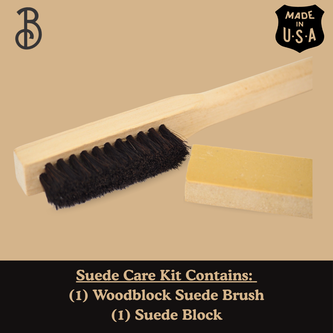 Keep your suede looking sharp with the right tools for the job. Our Suede Care Kit pairs a natural horsehair brush with a suede gum eraser—built to handle everyday scuffs, stains, and the wear that comes with real use.